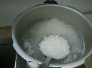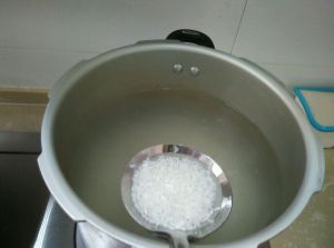 大米洗净,加入水、滴入几滴色拉油,浸泡30分钟。(窍门在这里,用油浸泡过的大米可以快速的煮到软糯,开花。)