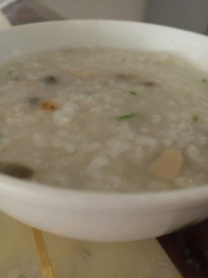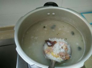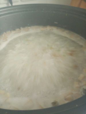 大米煮到烂烂的,放入猪肉,皮蛋,姜,在煮十分钟,加入葱花。在煮一分钟。