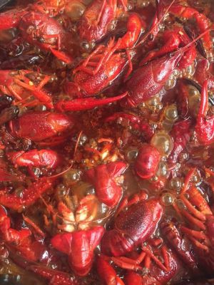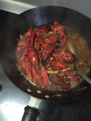 我自己炒的图忘拍了 用张朋友拍的照片…言归正传 把龙虾放入炒香的底料翻炒片刻到入啤酒 没过龙虾 加老抽 海鲜酱油 盐 糖