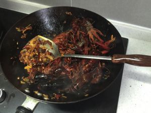 炒至龙虾变红,下料酒(稍多点,不用加水了)继续翻炒。
