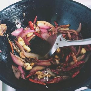 热锅凉油放入姜蒜洋葱爆香 转小火放入麻椒花椒辣椒 火锅底料 炒香