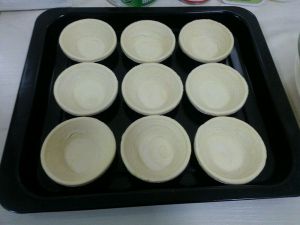 最后,把面团擀开卷成圆形,切成3—5厘米的厚度放在挞膜上………
