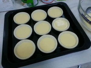 至于,挞液的话,我是直接一瓶250的牛奶,糖,奶油,放入锅中煮开,冷却,然后当两个蛋黄,过筛,放入挞膜就好了……^_^