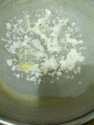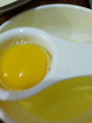 一个蛋打开,蛋黄打散 蛋清可另做他用,比如我就拿去腌肉了 把蛋黄倒入混合液中,再过筛两次,成品蛋挞水就完成啦,一定要过筛哦,为了好的口感