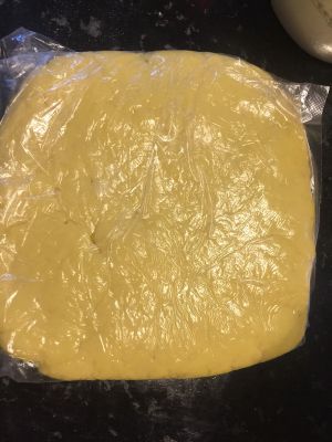 把低筋面粉和高筋面粉黄油和在一起,把它整成包子样,放入冰箱松弛1小时…拿出来………
