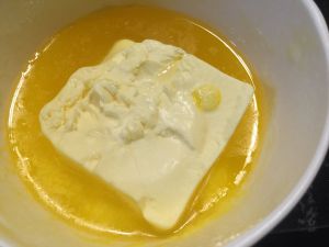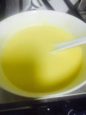 牛奶,白砂糖,吉士粉,淡奶油一同倒入容器中,搅拌均匀至白砂糖融化。(也可以隔水加热,这样白砂糖会更快融化些~)