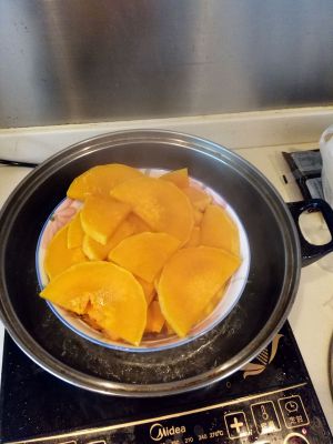 将切好的南瓜上锅蒸熟,也可以用微波炉