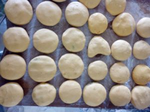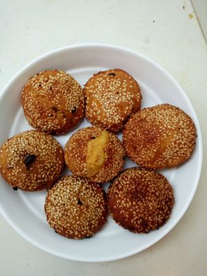 放入红豆沙后揉圆,轻轻压平一边,喜欢芝麻的话可以裹上白芝麻