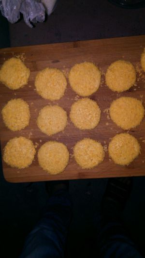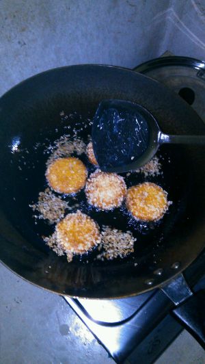 面包糠好了就可以放到有温度的油里炸下 炸到飘上去一会儿(根据自己情况定)