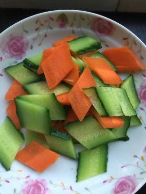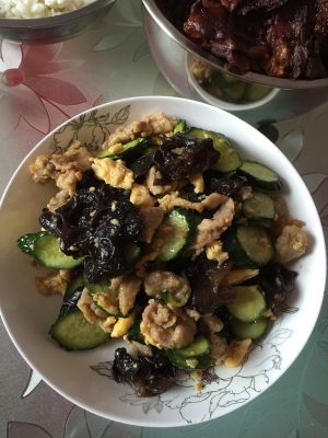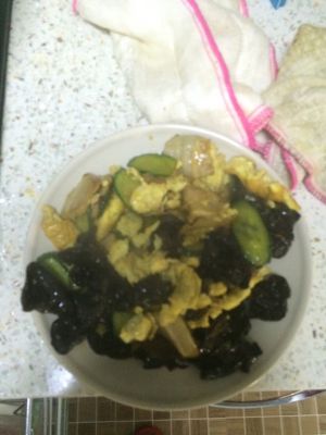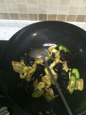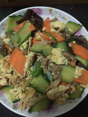 先炒鸡蛋盛出 再炒葱姜,胡萝卜,黄瓜,木耳 加入调料