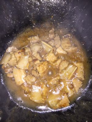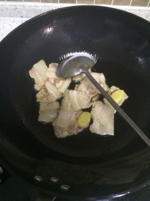 锅中加入油后加入腌制好的五花肉,翻炒变色后加入生抽调色,再加入开水煮熟