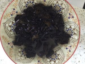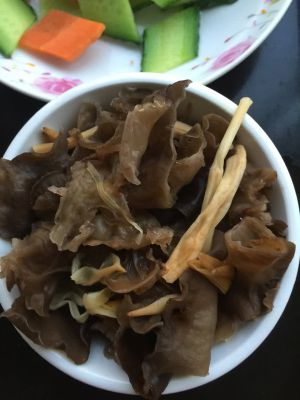 木耳、黄花放入烧开的水中泡开,择净,改刀备用