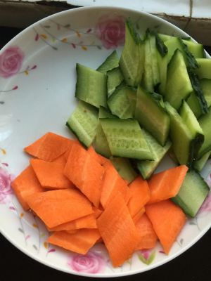 锅中水烧开后加入黄瓜片,胡萝卜片抄水后捞出,再加入木耳黄花菜煮开后捞出备用