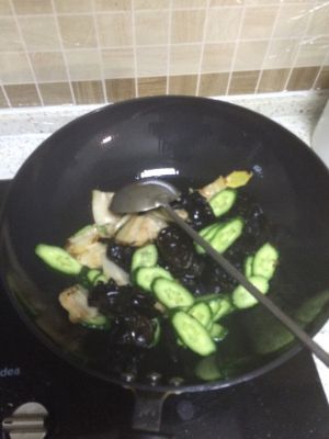 依次放入木耳、黄花、炒好的鸡蛋、黄瓜煸炒至黄瓜变色,加入盐、生抽调味出锅