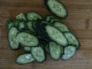 腌肉的过程中把黄瓜切片,炒鸡蛋,木耳一定要用水焯一下,多焯会儿没事,这样的木耳才会好吃