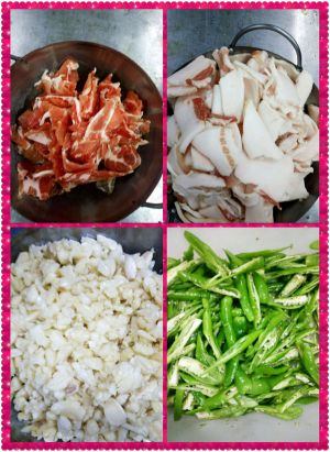 1、五花肉烫去毛,洗净,切薄片待用,;青红椒切圆片,煸香。