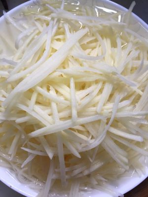 切丝淘洗,然后淡盐水浸泡下,下锅之前再滤洗一下