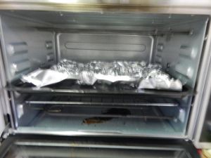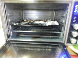 将羊排从锡纸中拿出,表面撒芝麻,孜然粉,置于烤网上,下垫烤盘,继续250度,10分钟。