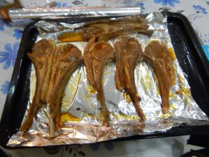 烤制:烤箱190°C预热10分钟。烤盤鋪上铝箔纸,將腌制好的羊排摆在烤盘上,每塊羊排上放上一小塊黃油,旁边放上兩枝迷迭香,入烤箱上下火加熱40分钟,中間給羊排翻一次身。