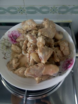 鸡腿肉切成小块,凉水下锅,煮沸,去除血水