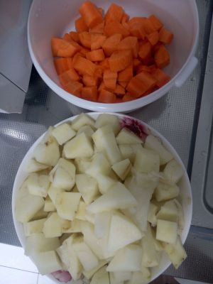 鸡和土豆切块儿。
