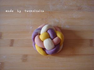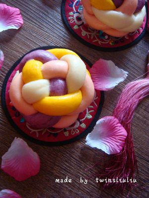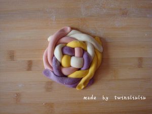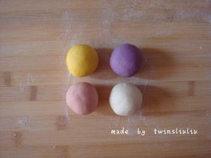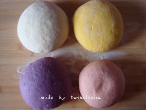 将面粉加入酵母、泡打粉,搅拌均匀后分成四份。其中三份分别用南瓜泥、紫薯泥、红曲粉加水和成三种彩色的面团,再将另外一份面粉用清水和成白色面团。将四色面团放在不同的容器中盖上湿润的屉布分别发酵。