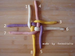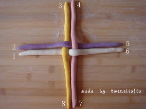 将四种颜色的剂子分别搓成细长条。撒上少许薄面,一条压一条,如图所示摆成“井”字。长条的两端稍细一些会更利于后面的操作。