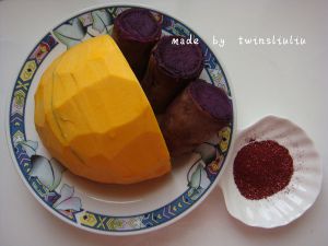 将紫薯、南瓜蒸熟。南瓜可切片再进行蒸制,这样方便成熟。蒸熟后碾成泥备用。