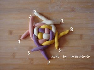三份面团分别再揉长,然后两个长条平行放,第三根面条叠加在两条上面,侧面看就是一个三角形。用手挤压一下。然后一段一段揪下来(不能用刀切,不然就不能开花了)。揪下来的断面朝上。