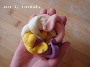 把黑色面团做小眼睛做嘴巴(这里自己随意装饰,按个人喜欢做小表情)