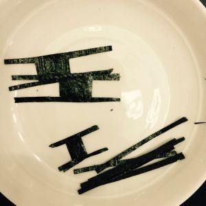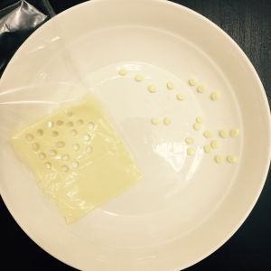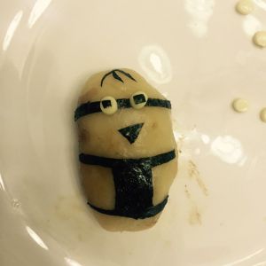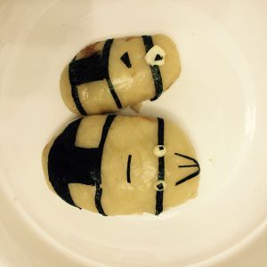 用芝士做小黄人的眼白,也可以用蛋白。工具可以用饮料的吸管。