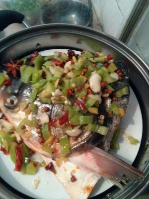 先将鱼头洗干净,装在合适的盘中,在鱼头上抹点盐,料酒,放点姜片大蒜,最后在鱼头上放剁椒(一般都是买的瓶装,可以自己做哦) 放在锅中隔水蒸10分钟左右