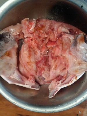 把鱼头反过来用一勺量盐腌好,再放入料酒去腥味,也可以放些醋。胡椒粉少许~