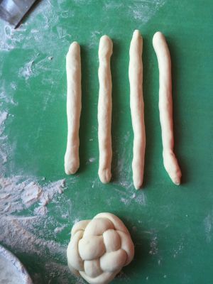 以上各种料和面粉,少量牛奶,酵母粉,不要加水,揉搓,弄成棍状,切,不要太宽