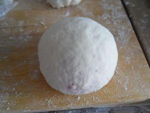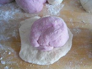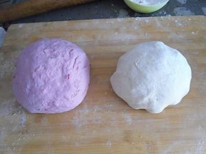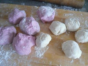 紫色面剂子擀成面皮,不用太薄,白色面剂子揉成光滑的球状。