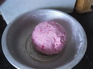 和成光滑的粉色面团。覆盖保鲜膜,发酵2倍大。