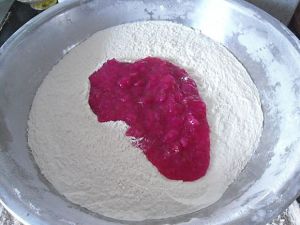 面粉中加酵母粉、火龙果皮汁,搅拌成面穗。