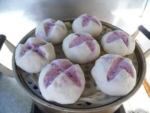 静置3—5分钟后,揭盖锅盖。哇塞,粉色哪里去了…… 出锅装盘,品味变色馒头吧。
