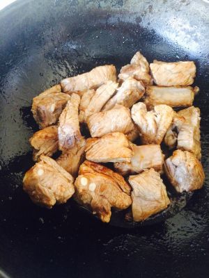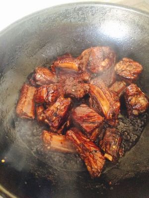 倒入备好的肋排,加适量料酒酱油,中火翻炒约一分钟。