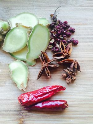 锅中放入少量油,烧至冒烟,放入姜、大葱爆香,再把排骨放入,翻炒片刻; 放入水,水开时放入八角、陈皮、胡萝卜和香菇;..放入调料(料酒、盐、糖和老抽),大火烧20-30分钟;