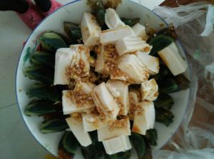 豆腐直接用刀切几下,皮蛋大蒜辣椒切粒放上去。