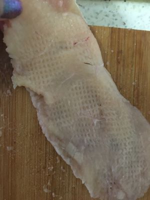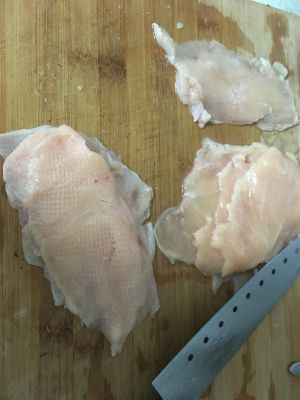 ①将洗净的鸡胸肉片成薄片(我买的是冷冻的只稍稍解冻,硬硬的非常容易切整齐)( ˃᷄˶˶̫˶˂᷅ )