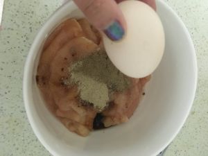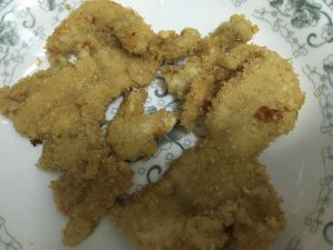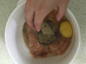 鸡胸肉从中间横着切,分成两片,用松肉锤子敲打鸡胸肉,把肉打散,把所有调料都加进去,腌制15分钟(这几步忘了拍照了)。拿个盘子,倒入淀粉,把腌制好的鸡胸肉裹上淀粉,另拿一个盘子,把裹好淀粉的鸡胸肉放好,在向上一面刷上鸡蛋液,铺上面包糠,换另一面继续同样的步骤