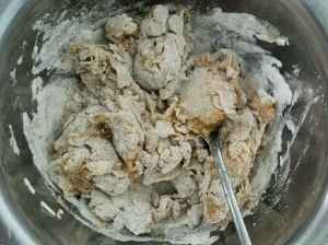 慢慢加水至面粉中,不要太湿,加到如图就可以了。