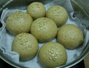 再把面揉匀(面发酵后有点湿,可加少量干面粉使其不粘手)把面团分别撮成一个个圆圆的球球,然后在球球上尽可能多的粘上燕麦。放入笼屉中。注意此时需醒面20分钟…