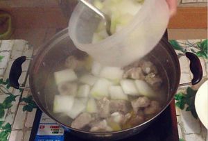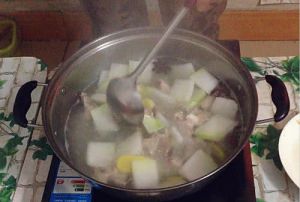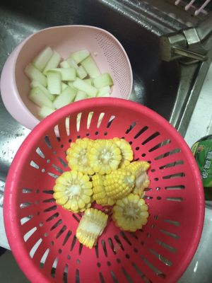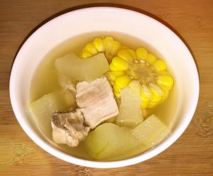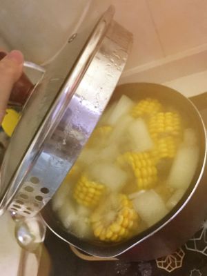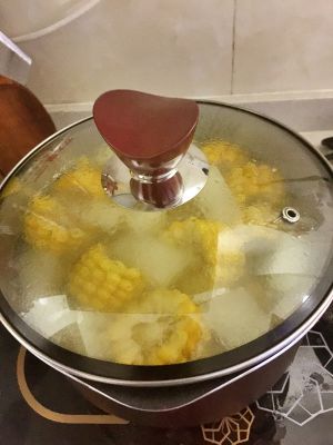 四十分钟后把冬瓜玉米放进锅内。继续小火煮20分钟。