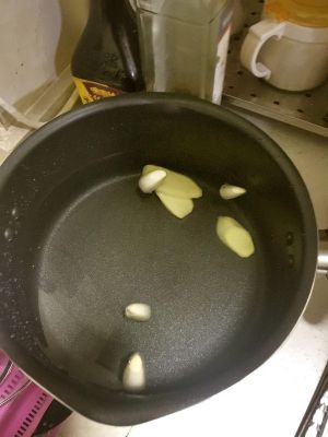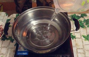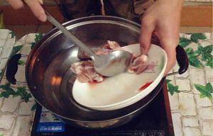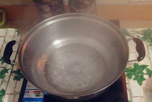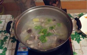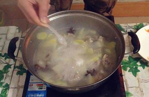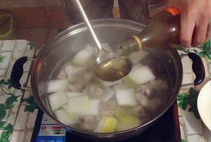 汤锅中放入清水。半勺料酒和剩下的姜蒜,还可以放几滴味极鲜提提鲜味。