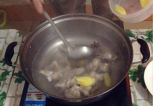 先把排骨放清水中泡半个小时泡出血水(忘记拍照啦),然后准备一锅清水。放入一勺料酒。大部分的姜,蒜,还有所有的葱。煮开后放排骨煮7分钟左右。把浮沫都煮出来。