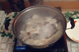 先把排骨焯一下水,洗干净,放入葱段姜片,然后开始大火煮开。