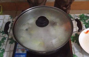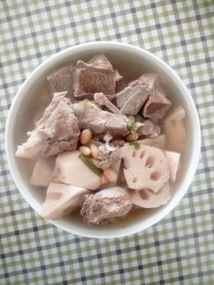 哎呀,蒸汽不断的往上冒,拍不清楚了。 排骨和花生一起煮大概20分钟左右,放入准备好的藕(斜刀块)!大火烧开,换小火慢炖,之后就准备等着煮好放调料起锅!